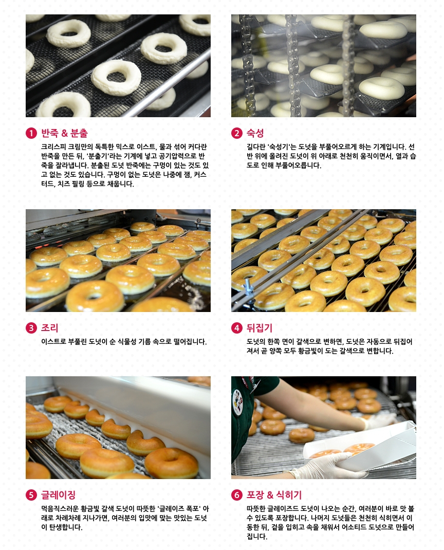 크리스피 크림의 도넛 제조과정은 총 여섯 단계를 거친다고 한다.